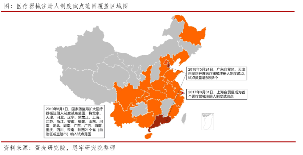 醫(yī)療器械注冊(cè)人制度是國(guó)際社會(huì)普遍采用的醫(yī)療器械管理制度,制度的實(shí)施實(shí)現(xiàn)了生產(chǎn)與研發(fā)的解綁,有利于促進(jìn)醫(yī)療器械企業(yè)、研發(fā)單位與CRO機(jī)構(gòu)的合作,醫(yī)療器械CRO & CDMO行業(yè)將迎來(lái)重大發(fā)展機(jī)遇。2017年,國(guó)務(wù)院印發(fā)《關(guān)于深化審評(píng)審批制度改革鼓勵(lì)藥品醫(yī)療器械創(chuàng)新的意見》,標(biāo)志著醫(yī)療器械上市許可持有人制度正式在國(guó)內(nèi)開始施行。此次政策組合拳從研發(fā)、臨床試驗(yàn)、產(chǎn)品所有者權(quán)益和生產(chǎn)企業(yè)整條產(chǎn)業(yè)鏈的源頭進(jìn)行政策引導(dǎo),鼓勵(lì)藥品和醫(yī)療器械的創(chuàng)新,簡(jiǎn)化監(jiān)管流程,提升審批速度。2019年8月,國(guó)家藥監(jiān)局發(fā)布《關(guān)于擴(kuò)大醫(yī)療器械注冊(cè)人制度試點(diǎn)工作的通知》,將試點(diǎn)范圍擴(kuò)大至21個(gè)省市。截至2019年12月底,21個(gè)試點(diǎn)省市全部發(fā)布了醫(yī)療器械注冊(cè)人制度實(shí)施方案。