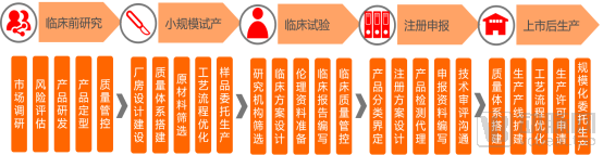 醫(yī)療器械研發(fā)外包服務(wù)涵蓋臨床前研究、小規(guī)模試產(chǎn)、臨床試驗、注冊申報和上市后生產(chǎn)5個環(huán)節(jié)。根據(jù)不同環(huán)節(jié)提供針對性的服務(wù),主要包括市場調(diào)研、風險管理、產(chǎn)品定型、廠房設(shè)計建設(shè)、工藝流程優(yōu)化、臨床試驗方案設(shè)計、申報資料編寫、規(guī)?;猩a(chǎn)等。醫(yī)療器械研發(fā)外包服務(wù)企業(yè)包括醫(yī)療器械CRO與醫(yī)療器械CDMO兩類。