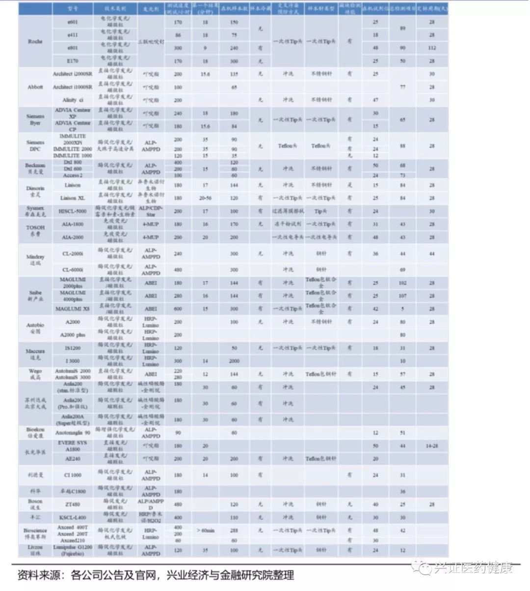 我們通過醫(yī)院端的市場(chǎng)對(duì)于化學(xué)發(fā)光的市場(chǎng)規(guī)模進(jìn)行估算:截至2018年9月,國內(nèi)三級(jí)醫(yī)院、二級(jí)醫(yī)院、一級(jí)醫(yī)院數(shù)量分別為2460、8714、10323家。自上而下測(cè)算發(fā)光需求,對(duì)于三級(jí)醫(yī)院,精確、穩(wěn)定的檢測(cè)結(jié)果是其關(guān)注重點(diǎn),這也是進(jìn)口化學(xué)發(fā)光品牌的“基本盤”。根據(jù)草根調(diào)研數(shù)據(jù),國內(nèi)頂尖三甲醫(yī)院中心檢驗(yàn)室大約擁有幾十臺(tái)發(fā)光儀器,儀器廠商較為分散,進(jìn)口占據(jù)90%的市場(chǎng);普通三級(jí)醫(yī)院擁有約10臺(tái)發(fā)光儀器,每個(gè)廠家儀器各1臺(tái),專機(jī)專用,檢測(cè)該廠家拳頭項(xiàng)目,例如羅氏的腫瘤標(biāo)志物、雅培的傳染病等,進(jìn)口儀器與國產(chǎn)儀器的比例約為7:3;對(duì)于二級(jí)醫(yī)院,平均擁有4臺(tái)發(fā)光儀器,由于其關(guān)注檢驗(yàn)的性價(jià)比,平均擁有3臺(tái)國產(chǎn)發(fā)光儀器,這也是國產(chǎn)品牌的“主戰(zhàn)場(chǎng)”;對(duì)于一級(jí)醫(yī)院,更為關(guān)注是否可以開展發(fā)光檢測(cè)項(xiàng)目及性價(jià)比,平均擁有1臺(tái)機(jī)器,多為國產(chǎn)。