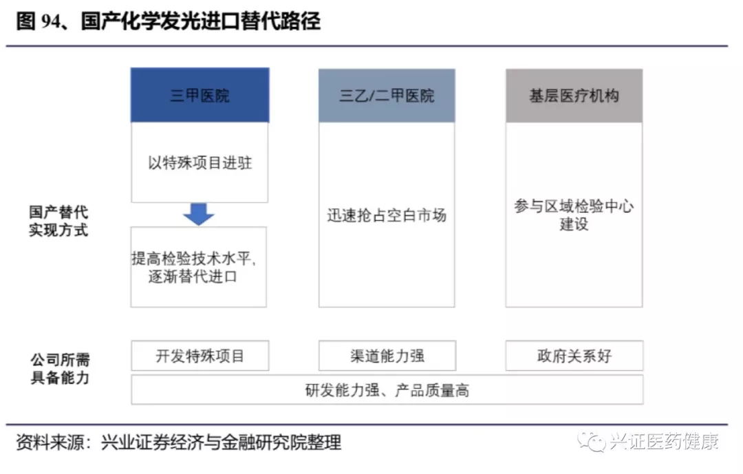 化學(xué)發(fā)光是典型的技術(shù)驅(qū)動(dòng)型產(chǎn)業(yè),研發(fā)壁壘較高。國產(chǎn)品牌的可靠性和穩(wěn)定性暫時(shí)難以滿足大型三甲醫(yī)院要求,但與二級(jí)及以下的基層醫(yī)院的剛性需求相契合。國產(chǎn)品牌在三甲醫(yī)院雖投放了少量特色檢驗(yàn)項(xiàng)目,但難以獲得腫瘤標(biāo)志物等核心項(xiàng)目,市場(chǎng)有限;而二級(jí)及以下的基層醫(yī)院存在傳染?。ǜ窝讬z測(cè))、性腺、甲功等大容量項(xiàng)目的剛性方法學(xué)替代需求,且較低的試劑價(jià)格(一般為進(jìn)口試劑的30%-50%)也滿足了醫(yī)院對(duì)經(jīng)費(fèi)預(yù)算限制。在IVD領(lǐng)域,因?yàn)獒t(yī)院檢驗(yàn)費(fèi)是打包收費(fèi)的,即檢驗(yàn)費(fèi)用已經(jīng)包含了相應(yīng)的診斷產(chǎn)品費(fèi)用,所以雖然醫(yī)院有動(dòng)力選擇高價(jià)格的新型檢測(cè)技術(shù),但在技術(shù)平臺(tái)確定后(即檢驗(yàn)費(fèi)用確定后),診斷產(chǎn)品即成為醫(yī)院的成本。在這種情況下,對(duì)于技術(shù)性能相當(dāng)或類似的同種產(chǎn)品,顯然醫(yī)院將偏好價(jià)格更低的產(chǎn)品,而低價(jià)格正是國內(nèi)IVD龍頭公司相比跨國公司的主要競(jìng)爭(zhēng)優(yōu)勢(shì)。三甲醫(yī)院由于外資產(chǎn)品先入為主,加之對(duì)科研和設(shè)備品牌的需求,內(nèi)資產(chǎn)品(尤其是診斷儀器)進(jìn)入難度較大;基層醫(yī)療機(jī)構(gòu)則由于經(jīng)費(fèi)和病人數(shù)目有限,難以形成規(guī)模效應(yīng),對(duì)于高通量的新檢測(cè)技術(shù)需求并不大;而三乙/二甲級(jí)別的中檔醫(yī)院既有動(dòng)力開展高價(jià)檢測(cè)項(xiàng)目,又由于資金相對(duì)不足,傾向于選擇物美價(jià)廉的產(chǎn)品,因此是內(nèi)資企業(yè)新產(chǎn)品的理想目標(biāo)客戶(且從歷史上來看,國內(nèi)IVD龍頭企業(yè)的全自動(dòng)生化儀/血液分析儀也主要是在三乙/二甲醫(yī)院進(jìn)行銷售)。