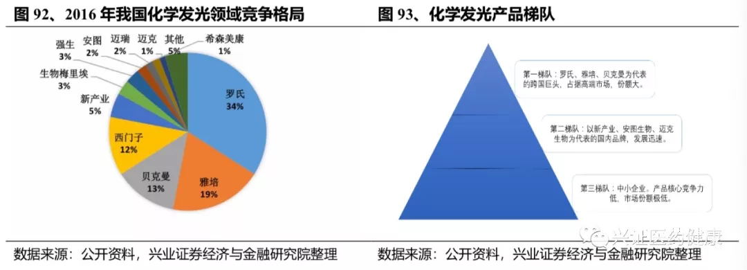 化學(xué)發(fā)光免疫診斷技術(shù)以化學(xué)發(fā)光劑、催化發(fā)光酶等物質(zhì)標(biāo)記抗原或抗體,當(dāng)被標(biāo)記的抗原或抗體與相應(yīng)抗體、抗原相結(jié)合后,發(fā)光底物受發(fā)光劑、催化酶等物質(zhì)作用,發(fā)生氧化還原反應(yīng)。相較于傳統(tǒng)生化診斷,化學(xué)發(fā)光具有自動(dòng)化程度高、特異性好、精確度高、檢測(cè)范圍廣等優(yōu)勢(shì)?;瘜W(xué)發(fā)光是IVD巨頭的必爭(zhēng)之地,自2003年西門子化學(xué)發(fā)光產(chǎn)品進(jìn)入中國以來,IVD四巨頭羅氏、雅培、丹納赫(2011年并購貝克曼)和西門子占據(jù)化學(xué)發(fā)光市場(chǎng)70%以上的份額,強(qiáng)生、生物-梅里埃和希森美康等跨國巨頭也加緊中國市場(chǎng)的攻城略地。自2011年新產(chǎn)業(yè)和邁克首批推出國產(chǎn)全自動(dòng)化學(xué)發(fā)光免疫分析儀以來,國產(chǎn)品牌加入競(jìng)爭(zhēng)。目前國內(nèi)發(fā)光市場(chǎng)基本形成“4+4”的競(jìng)爭(zhēng)格局,羅氏、雅培、西門子、貝克曼4家外資巨頭占有超過70%的市場(chǎng)份額,三甲醫(yī)院是其主要客戶,國內(nèi)企業(yè)新產(chǎn)業(yè)、安圖生物、邁克生物、邁瑞醫(yī)療4家占有近10%的市場(chǎng)份額。