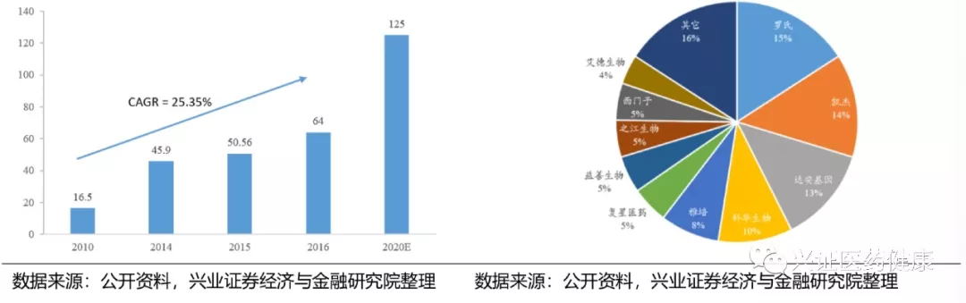 分子診斷是精準(zhǔn)醫(yī)療的技術(shù)基礎(chǔ),也是IVD增速最快的子行業(yè)。由于分子診斷是從基因?qū)哟芜M(jìn)行檢測(cè),因此檢測(cè)靈敏度和準(zhǔn)確性相對(duì)較高,可在感染初期識(shí)別病毒或者提早確認(rèn)基因缺陷,從而提供個(gè)性化的醫(yī)療診斷服務(wù),主要應(yīng)用于遺傳病、傳染性疾病、腫瘤等疾病的檢測(cè)與診斷。分子診斷逐步由以PCR為主變成以基因測(cè)序?yàn)橹鳎訮CR、熒光原位雜交(FISH)、基因芯片為輔的多種檢測(cè)手段共存的分子診斷市場(chǎng)。基因測(cè)序因?yàn)槠涓咄?、操作方便、信息量豐富、應(yīng)用范圍寬等優(yōu)點(diǎn)成為最有前途的檢測(cè)技術(shù),目前屬于“黃金投資時(shí)期”。2010年我國分子診斷市場(chǎng)規(guī)模僅為16.5億元,到2016年已達(dá)到64億元,期間復(fù)合增長(zhǎng)率高達(dá)25.35%,預(yù)計(jì)2020年有望實(shí)現(xiàn)125億元。我國分子診斷技術(shù)起步較晚,市場(chǎng)占有率低。最近5年,國內(nèi)在測(cè)序儀上的開發(fā)策略分為兩類:第一類是通過與國外生產(chǎn)商合作,買斷產(chǎn)品在國內(nèi)的全部專利;第二類是自主研發(fā)模式。無論第一類還是第二類,國產(chǎn)測(cè)序儀都一定程度上搶占了Illumina、Life Technologies公司的市場(chǎng)份額。2012年,華大基因并購美國基因測(cè)序公司CG,2014年BGISEQ-100(基于Life Tech的Ion Proton測(cè)序平臺(tái))和BGISEQ-1000(基于CG的測(cè)序平臺(tái))基因測(cè)序產(chǎn)品率先獲批上市,2016年10月及2017年1月,華大基因BGISEQ-500基因測(cè)序儀器及無創(chuàng)產(chǎn)前基因測(cè)序業(yè)務(wù)的配套試劑獲得了CFDA醫(yī)療器械注冊(cè)。
