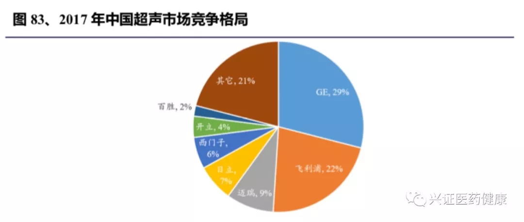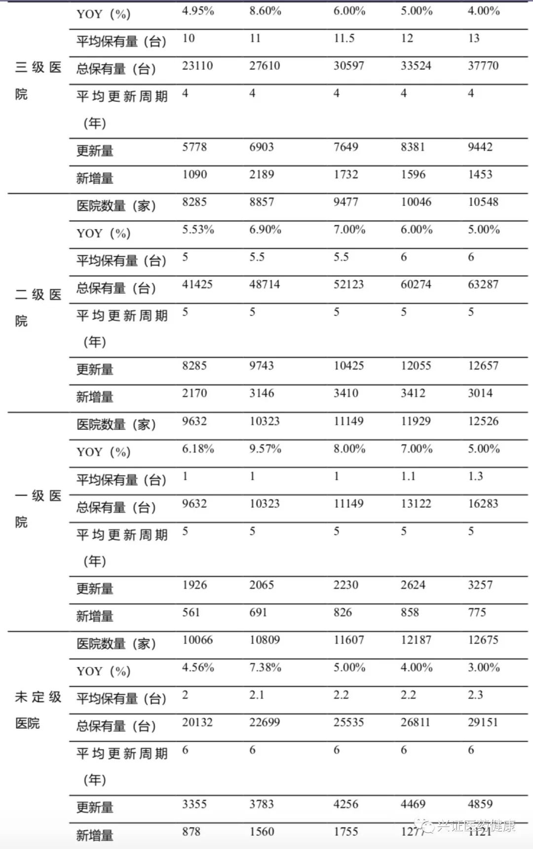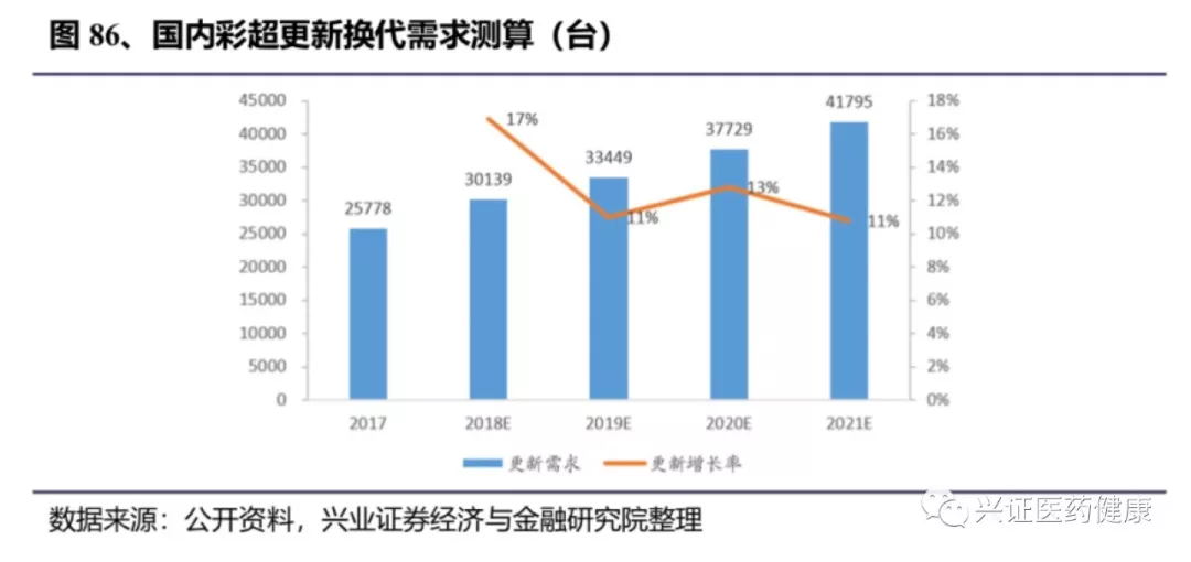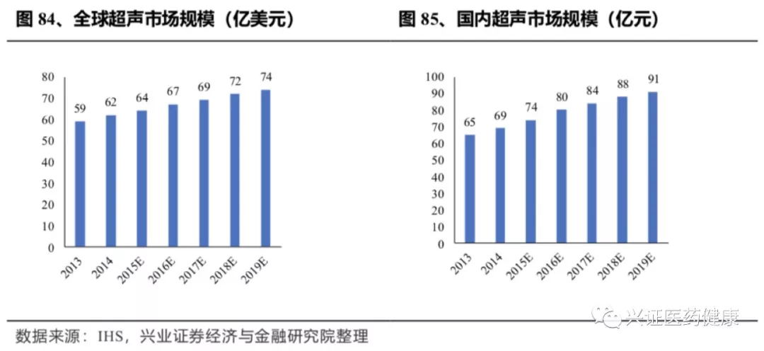 彩超是利用超聲多普勒技術(shù)和超聲回波原理,采集血流運(yùn)動(dòng)、組織運(yùn)動(dòng)信息和人體器官組織成像供臨床超聲診斷檢查使用的設(shè)備。國產(chǎn)設(shè)備以性價(jià)比優(yōu)勢(shì),逐步擠占進(jìn)口品牌市場(chǎng)份額。在全球市場(chǎng)中,通用、飛利浦、東芝、日立和西門子占據(jù)了主要的市場(chǎng)份額,國產(chǎn)企業(yè)邁瑞和開立也躋身全球前十名。國內(nèi)市場(chǎng)上,2017年,GE 和飛利浦占據(jù)50%以上的市場(chǎng)份額,西門子近幾年市場(chǎng)份額日益萎縮,已被邁瑞醫(yī)療超越。2014年,全球醫(yī)用超聲診斷設(shè)備市場(chǎng)規(guī)模已達(dá)62億美元,預(yù)計(jì)2019年,規(guī)模將達(dá)74億美元,年均復(fù)合增長(zhǎng)率為3.6%。2014年,國內(nèi)超聲診斷設(shè)備市場(chǎng)69億元, 由于醫(yī)療反腐,2015年彩超設(shè)備的銷量下滑明顯,當(dāng)年銷量為23970臺(tái)。隨著設(shè)備新增及更新?lián)Q代需求擴(kuò)大,中國超聲設(shè)備市場(chǎng)還將快速增長(zhǎng),預(yù)計(jì)2019年,中國醫(yī)用超聲診斷設(shè)備市場(chǎng)規(guī)模將達(dá)91億元,年均復(fù)合增長(zhǎng)率5.7%。未來五年,是國內(nèi)彩超完成進(jìn)口替代的關(guān)鍵五年,伴隨著以邁瑞醫(yī)療、開立醫(yī)療為首的國產(chǎn)彩超企業(yè)技術(shù)平臺(tái)不斷升級(jí)。邁瑞醫(yī)療2013年并購高端超聲影像制造商Zonare 加快了公司產(chǎn)品向高端延伸的進(jìn)程,2016-2017年,公司先后推出了Resona7 等高端彩超產(chǎn)品,受到市場(chǎng)的廣泛認(rèn)可,公司超聲影像類產(chǎn)品的整體形象快速提升。開立醫(yī)療于2016年底推出全新高端S50彩超平臺(tái),上市后迅速放量,目前S50在總收入中的占比提升到近25%,今年一季度又推出嵌入人工智能的S60彩超平臺(tái),配置第二代的單晶探頭,成像速度、信噪比、靈敏度都有所提升,預(yù)計(jì)未來3年內(nèi)高端彩超收入占比能夠達(dá)到40%以上,醫(yī)院覆蓋率的提升以及存量?jī)x器的更新?lián)Q代促進(jìn)彩超的銷售。國產(chǎn)企業(yè)超聲核心部件的研發(fā)水平已媲美GPS,超聲探頭技術(shù)是決定超聲系統(tǒng)性能的核心技術(shù)之一,例如開立醫(yī)療在當(dāng)今超聲領(lǐng)域最高端的單晶探頭技術(shù)方面,躋身國際一流水平,為整個(gè)系統(tǒng)性能的先進(jìn)性提供了核心技術(shù)保障。截至2017年底,各類衛(wèi)生機(jī)構(gòu)的彩超平均保有量不同。根據(jù)草根調(diào)研數(shù)據(jù),三級(jí)醫(yī)院平均可達(dá)10臺(tái),二級(jí)醫(yī)院5臺(tái),一級(jí)醫(yī)院1臺(tái),未定級(jí)醫(yī)院2臺(tái)(主要為民營(yíng)醫(yī)院),社區(qū)衛(wèi)生機(jī)構(gòu)0.5臺(tái),婦幼保健機(jī)構(gòu)1臺(tái)。未來國內(nèi)彩超的需求新增主要來自三方面:一是現(xiàn)有彩超的更新替代,彩超平均更新周期為5年,對(duì)于使用頻繁、損耗較快的三級(jí)醫(yī)院不到5年就需要更換彩超設(shè)備;二是新建醫(yī)療衛(wèi)生機(jī)構(gòu)帶來的增量需求;三是胸痛、卒中、創(chuàng)傷、危重孕產(chǎn)婦、危重新生兒等市級(jí)五大救治中心和縣區(qū)分中心的建設(shè),胸痛中心、危重孕產(chǎn)婦救治中心、危重新生兒救治中心和卒中中心均要求配置不少于1臺(tái)彩超,其中胸痛中心自2017年開始建設(shè),根據(jù)中國胸痛中心系統(tǒng)化建設(shè)項(xiàng)目規(guī)劃,預(yù)計(jì)到2019年底,全國將建成超過1000家胸痛中心,預(yù)計(jì)最少新增1000臺(tái)彩超,而2018年才開始建設(shè)的其余四大中心,預(yù)計(jì)將在3-5年全部完成建立,屆時(shí)預(yù)計(jì)每年釋放超過2000臺(tái)的彩超需求?;谝陨戏治觯覀儗?duì)彩超國內(nèi)市場(chǎng)空間進(jìn)行測(cè)算如下: