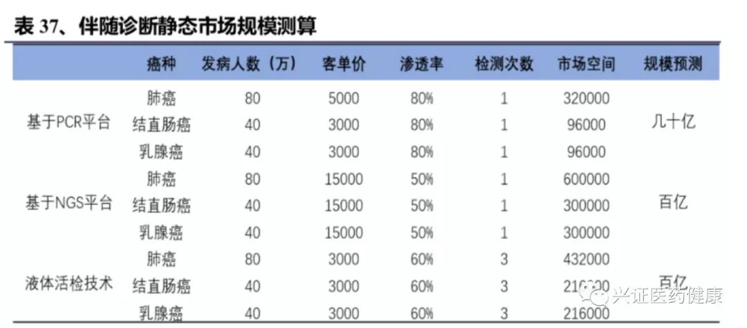 百億市場(chǎng)空間,技術(shù)更新進(jìn)一步拓寬天花板。隨著我國老齡化加深及腫瘤患者生存率提升,持續(xù)增加的腫瘤患者會(huì)在存量及增量?jī)蓚€(gè)維度上,增加對(duì)伴隨診斷產(chǎn)品的需求。按當(dāng)前每年主要靶向藥物覆蓋癌種的發(fā)病人群為基礎(chǔ),基于目前的檢測(cè)技術(shù)以及當(dāng)前滲透率和預(yù)期滲透率(我國30%左右,歐美等發(fā)達(dá)國家達(dá)到70-80%)進(jìn)行估計(jì)。目前在醫(yī)院內(nèi)開展的伴隨診斷還是以PCR技術(shù)平臺(tái)為主的試劑盒,基于NGS平臺(tái)的檢測(cè)試劑盒及液體活檢的試劑盒于2018年陸續(xù)獲批,預(yù)計(jì)2019年將大規(guī)模開展進(jìn)院?;谝陨霞僭O(shè),我們可以測(cè)算出,伴隨診斷的靜態(tài)市場(chǎng)空間在百億以上。