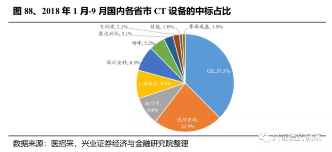 CT是根據(jù)人體不同組織對(duì)X線的吸收與透過率的不同,應(yīng)用靈敏度極高的儀器對(duì)人體進(jìn)行測(cè)量,然后將測(cè)量所獲取的數(shù)據(jù)輸入計(jì)算機(jī),再對(duì)數(shù)據(jù)進(jìn)行處理后,就可攝下人體被檢查部位的斷面或立體的圖像,發(fā)現(xiàn)體內(nèi)任何部位的細(xì)小病變。根據(jù)中國醫(yī)學(xué)裝備協(xié)會(huì)發(fā)布的《2016年中國CT設(shè)備市場(chǎng)研究報(bào)告》,截止到2016年底,CT設(shè)備全國市場(chǎng)保有量突破20000臺(tái),相比2015年的19592臺(tái),保有量增長(zhǎng)10%;2012-2016年CT保有量復(fù)合增長(zhǎng)率為10.2%。2012年-2016年,我國CT設(shè)備市場(chǎng)每年新增銷量從2074臺(tái)增長(zhǎng)到了2575臺(tái),年復(fù)合增長(zhǎng)率為5%。我國在用的12074臺(tái)CT設(shè)備中,GPS呈現(xiàn)三足鼎立的競(jìng)爭(zhēng)格局,其中GE占34%,西門子占28%,飛利浦占14%,合計(jì)市占率達(dá)到86%。由于近年來國家政策的鼓勵(lì),東軟、聯(lián)影、安科等國產(chǎn)企業(yè)也開始發(fā)力,進(jìn)口設(shè)備的比例將持續(xù)降低。值得一提的是,在二級(jí)醫(yī)院市場(chǎng)中,國產(chǎn)品牌代表之一的東軟醫(yī)療打破國外壟斷,以超過10%的占有率躋身一線品牌行列。根據(jù)2018年1月-9月的全國各省市CT中標(biāo)結(jié)果來看,GE、東軟的中標(biāo)數(shù)最高,分別為36和22臺(tái);其次為西門子、聯(lián)影、安科,佳能、賽諾威盛中標(biāo)數(shù)量相對(duì)較少,已經(jīng)可以看到國產(chǎn)CT實(shí)現(xiàn)進(jìn)口替代的曙光。根據(jù)《2016年中國CT設(shè)備市場(chǎng)研究報(bào)告》,2015年,單雙層低端CT市場(chǎng)保有量占CT市場(chǎng)總額的51%,三級(jí)醫(yī)院主力機(jī)型64排及以上高端CT市場(chǎng)保有量占比接近20%。2015年16排CT銷量份額48%,單雙層CT銷量份額為15%,份額持續(xù)下滑,64排及以上高端CT銷量份額36%。近幾年,64排CT逐步代替16排CT成為縣級(jí)醫(yī)院的主力機(jī)型,而16排CT主要在鄉(xiāng)鎮(zhèn)衛(wèi)生院裝機(jī)較多。CT作為鄉(xiāng)鎮(zhèn)衛(wèi)生院服務(wù)能力標(biāo)準(zhǔn)(2018年版)A類鄉(xiāng)鎮(zhèn)衛(wèi)生院必配設(shè)備,基層醫(yī)療機(jī)構(gòu)更傾向于采購國產(chǎn)設(shè)備,一方面可以降低患者檢查成本,另一方面可以降低售后服務(wù)成本,這為國產(chǎn)品牌如東軟、聯(lián)影、安科、萬東等的進(jìn)口替代提供機(jī)會(huì)。國家衛(wèi)健委《大型醫(yī)用設(shè)備配置許可管理目錄(2018年)》提到部分設(shè)備如DSA、16排及以下CT、永磁磁共振無需再經(jīng)審批即可配置,對(duì)醫(yī)療機(jī)構(gòu)增加配置大型設(shè)備將起到正向激勵(lì)作用。衛(wèi)計(jì)委《關(guān)于發(fā)布2018—2020年大型醫(yī)用設(shè)備配置規(guī)劃的通知》中提到64排及以上CT未來三年內(nèi)國內(nèi)新增總臺(tái)數(shù)為3535臺(tái),也利好國內(nèi)生產(chǎn)該類設(shè)備的企業(yè)。此外,根據(jù)《2016年中國CT設(shè)備市場(chǎng)研究報(bào)告》,截止到2016年初,59%的CT設(shè)備購置在2010-2015年期間,28%的CT設(shè)備購置在2005-2010年期間,13%的CT設(shè)備購置在2005年以前,使用已超過10年,超期服役的設(shè)備大約有1500多臺(tái),這也是下一批更新?lián)Q代的主要對(duì)象,國產(chǎn)廠商有望搶奪部分市場(chǎng)份額。目前,我國國產(chǎn)CT的技術(shù)難點(diǎn)主要在于探測(cè)單元的制造工藝,要求探測(cè)單元陣列數(shù)多(即排數(shù)多)、旋轉(zhuǎn)及感應(yīng)速度快,對(duì)拼接工藝又有極高的標(biāo)準(zhǔn),需要單元與單元間隙盡可能小。在東軟醫(yī)療的帶領(lǐng)下,我國CT研發(fā)不斷實(shí)現(xiàn)技術(shù)突破,從東軟2012年推出首臺(tái)中國研制64排螺旋CT到2015年的128排螺旋CT,聯(lián)影、安科、萬東等企業(yè)也緊跟其腳步。目前,我國CT行業(yè)第一梯隊(duì)主要致力于64排CT的研發(fā)和注冊(cè),隨著滿足高性能檢測(cè)的64排CT的陸續(xù)上市,預(yù)計(jì)我國CT格局將發(fā)生改變。