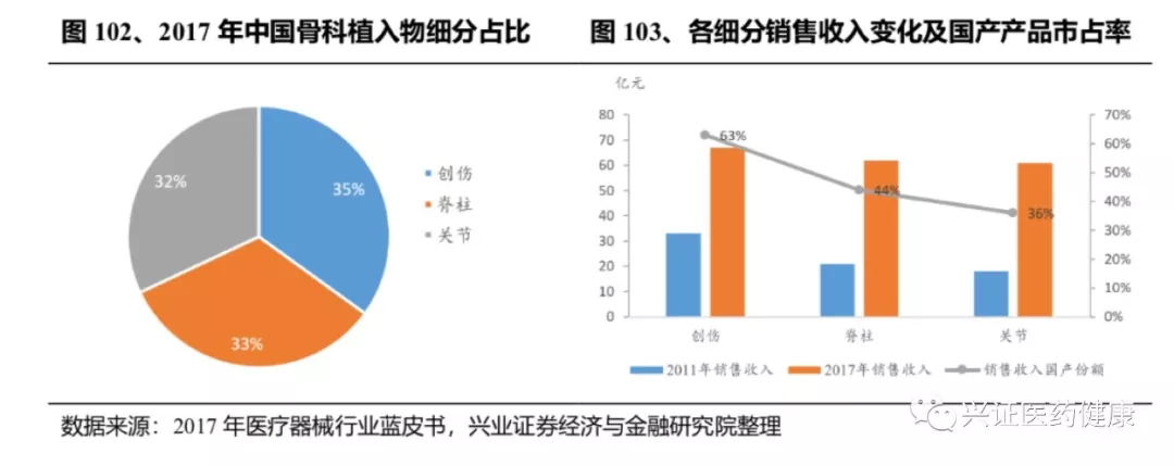 在國內(nèi)市場(chǎng),創(chuàng)傷、脊柱和關(guān)節(jié)三類細(xì)分銷售收入占比接近。其中,創(chuàng)傷植入類產(chǎn)品2010年-2017年銷售收入由33億元提升至67億元,復(fù)合增速為12.53%,國產(chǎn)化比例達(dá)到63%。該領(lǐng)域技術(shù)壁壘最低,是國內(nèi)生產(chǎn)廠商技術(shù)最為成熟、開發(fā)較早、國產(chǎn)化進(jìn)程最高的細(xì)分。目前,國內(nèi)市場(chǎng)份額較高的廠商有大博醫(yī)療、威高骨科和天津天正,提供了市面上近三分之一的國產(chǎn)創(chuàng)傷類產(chǎn)品,而行業(yè)內(nèi)其他廠商則普遍規(guī)模較小。脊柱類產(chǎn)品2010-2017年銷售收入由21億元增長(zhǎng)至62億元,復(fù)合增速19.77%,國產(chǎn)化比例約為44%,進(jìn)口替代程度低于創(chuàng)傷類產(chǎn)品,但市場(chǎng)集中度更高,國產(chǎn)廠商大博、威高、天正占據(jù)了國產(chǎn)脊柱類產(chǎn)品近一半的份額。2010-2017年人工關(guān)節(jié)類產(chǎn)品銷售收入由18億元增長(zhǎng)至61億元,復(fù)合增速最高為22.56%,但國產(chǎn)化進(jìn)程最慢,進(jìn)口產(chǎn)品依然占有絕對(duì)主導(dǎo)地位,主要原因是關(guān)節(jié)植入使用壽命可到15-20年,且生產(chǎn)工藝復(fù)雜,一方面對(duì)于生產(chǎn)廠商進(jìn)入壁壘高、研發(fā)投入大,另一方面關(guān)節(jié)植入大多為終身植入,消費(fèi)者更傾向于選擇技術(shù)發(fā)展成熟、口碑及服務(wù)都更有保障的進(jìn)口產(chǎn)品。但隨著愛康、春立等國產(chǎn)公司技術(shù)的發(fā)展以及醫(yī)保政策的影響,人工關(guān)節(jié)類產(chǎn)品將成為骨科進(jìn)口替代潛力最大的細(xì)分。