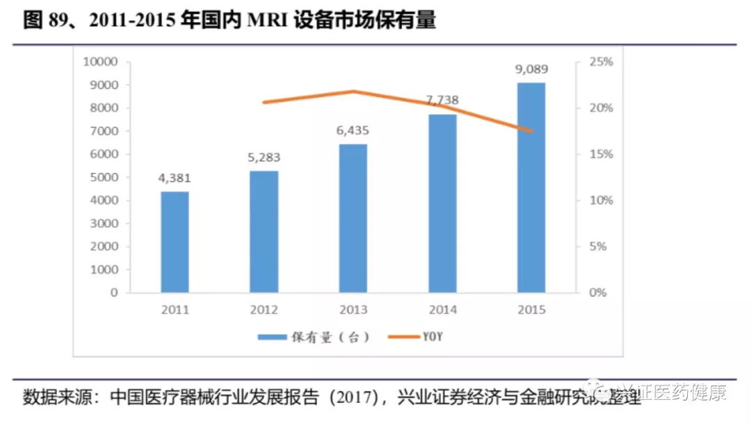 MRI(磁共振成像)通過對(duì)靜磁場(chǎng)中的人體施加某種特定頻率的射頻脈沖,使人體中的氫質(zhì)子受到激勵(lì)而發(fā)生磁共振現(xiàn)象。停止脈沖后,質(zhì)子在弛豫過程中產(chǎn)生磁共振成像術(shù)(MR)信號(hào),通過對(duì)MR信號(hào)的接收、空間編碼和圖像重建等處理過程,即產(chǎn)生MR信號(hào)。與其它成像技術(shù)(CT、超聲等)相比,MRI成像方式多樣、空間分辨率高、所獲信息更加豐富,常用于全身各系統(tǒng)的成像診斷,如顱腦、脊髓、心臟大血管、關(guān)節(jié)骨骼、軟組織及盆腔等。根據(jù)中國醫(yī)療器械行業(yè)發(fā)展報(bào)告的統(tǒng)計(jì),2011-2015年MRI設(shè)備市場(chǎng)保有量的年復(fù)合增長(zhǎng)率達(dá)到了20%,2015年MRI市場(chǎng)保有量9089臺(tái),新增銷量1422臺(tái)。超導(dǎo)MRI是MRI的主流產(chǎn)品,2015年1.5T超導(dǎo)在MRI總銷量中占比51%,3.0T超導(dǎo)占比15%,永磁占比34%。