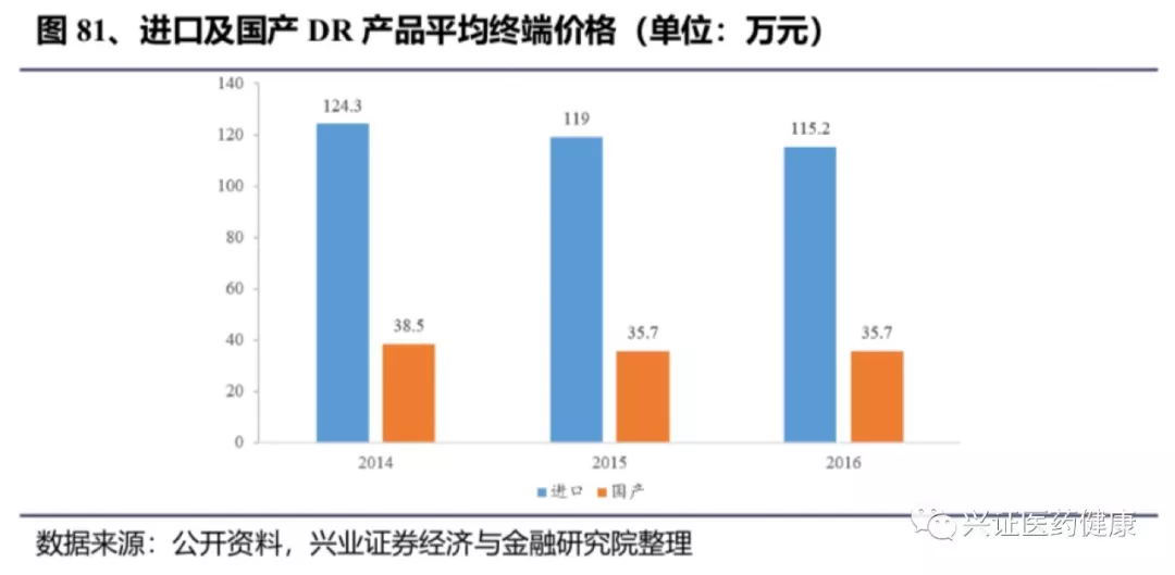 受分級(jí)診療、提升基層醫(yī)療機(jī)構(gòu)服務(wù)能力等政策影響,未來DR市場(chǎng)的主要驅(qū)動(dòng)力將來自于基層醫(yī)療機(jī)構(gòu),目前國內(nèi)基層醫(yī)療機(jī)構(gòu)由于預(yù)算有限,DR配置率較低,遠(yuǎn)未滿足需求,同時(shí)基層醫(yī)療機(jī)構(gòu)對(duì)產(chǎn)品價(jià)格比較敏感,科研需求少,加上國產(chǎn)DR產(chǎn)品操作系統(tǒng)更簡(jiǎn)單、界面更友好,更適合中國醫(yī)療工作者的使用,因此國產(chǎn)品牌更受青睞。2014-2016年,進(jìn)口DR產(chǎn)品平均價(jià)格在100萬以上,而國產(chǎn)DR產(chǎn)品的價(jià)格相對(duì)較低,近幾年,國產(chǎn)DR的發(fā)展大大降低了進(jìn)口產(chǎn)品的價(jià)格及維修費(fèi)用,目前進(jìn)口DR價(jià)格下降到60萬左右,約為國產(chǎn)的二倍。