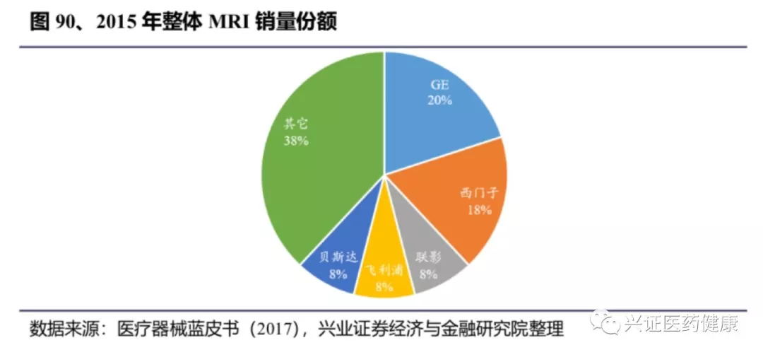 從市場(chǎng)競(jìng)爭(zhēng)格局來看,GE、飛利浦、西門子三家約占市場(chǎng)總額的一半,其中GE以20%的市場(chǎng)份額排名第一,西門子緊隨其后,聯(lián)影、飛利浦、貝斯達(dá)市場(chǎng)份額均為8%。聯(lián)影、東軟作為國產(chǎn)磁共振代表,在超導(dǎo)核磁共振領(lǐng)域,尤其在1.5T磁共振市場(chǎng)表現(xiàn)突出,其中聯(lián)影的1.5T超導(dǎo)MRI在2015年的國內(nèi)市場(chǎng)份額中已經(jīng)超越部分進(jìn)口企業(yè),MRI的市場(chǎng)競(jìng)爭(zhēng)已演變?yōu)閲鴥?nèi)外企業(yè)同臺(tái)競(jìng)技的格局。近幾年,國內(nèi)永磁的銷量增速為個(gè)位數(shù),價(jià)格也下降較多,目前國內(nèi)永磁MRI生產(chǎn)廠家基本均為國內(nèi)企業(yè),外資被擠出中國市場(chǎng),國內(nèi)永磁第一陣營(yíng)企業(yè)包括鑫高益、貝斯達(dá)、萬東醫(yī)療。國內(nèi)1.5T超導(dǎo)核磁市場(chǎng)增速較快,行業(yè)增速在20%以上,龍頭聯(lián)影、萬東等增速高于行業(yè)增速,比如萬東醫(yī)療2018年1.5T超導(dǎo)核磁的銷量翻倍增長(zhǎng),預(yù)計(jì)銷售臺(tái)數(shù)近50臺(tái)(2017年約為24臺(tái)),一方面原因是2017年起,國內(nèi)超導(dǎo)核磁核心零部件磁體、放大鏡等國產(chǎn)化從而降低成本,出廠價(jià)和終端價(jià)均大幅下降,并且未來每年以接近20%的比例降價(jià),很多基層醫(yī)院逐步能夠負(fù)擔(dān)得起;另一方面原因是很多臨床端應(yīng)用問題解決了,國產(chǎn)超導(dǎo)核磁得到了醫(yī)院的認(rèn)可。