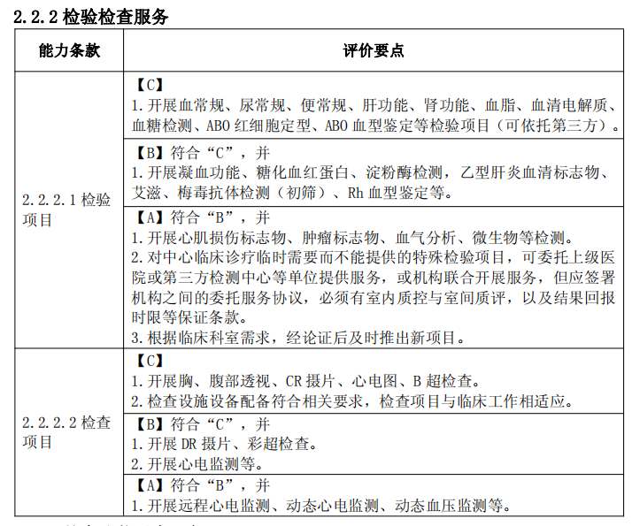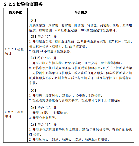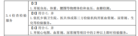 社區(qū)衛(wèi)生服務(wù)中心檢驗(yàn)檢查服務(wù)項(xiàng)目:【C】1.開(kāi)展身高、體重、腰圍等物理體檢和血壓、血糖檢測(cè)。1.依托鄉(xiāng)鎮(zhèn)衛(wèi)生院、醫(yī)共體或第三方檢驗(yàn)機(jī)構(gòu)開(kāi)展血常規(guī)、尿常規(guī)、生化等檢驗(yàn)服務(wù)。1.開(kāi)展心電圖、血常規(guī)、尿常規(guī)等項(xiàng)目中的 2 種以上即時(shí)檢驗(yàn)服務(wù)。