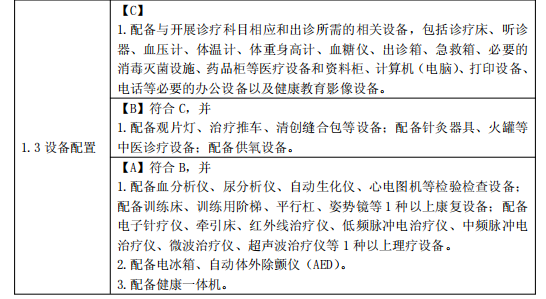 配備血分析儀、尿分析儀、自動(dòng)生化儀、心電圖機(jī)等檢驗(yàn)檢查設(shè)備;配備訓(xùn)練床、訓(xùn)練用階梯、平行杠、姿勢(shì)鏡等 1 種以上康復(fù)設(shè)備;配備電子針療儀、牽引床、紅外線治療儀、低頻脈沖電治療儀、中頻脈沖電治療儀、微波治療儀、超聲波治療儀等 1 種以上理療設(shè)備。2.配備電冰箱、自動(dòng)體外除顫儀(AED)。
